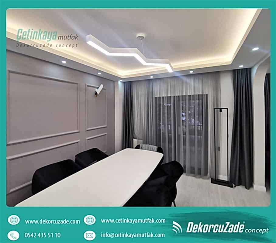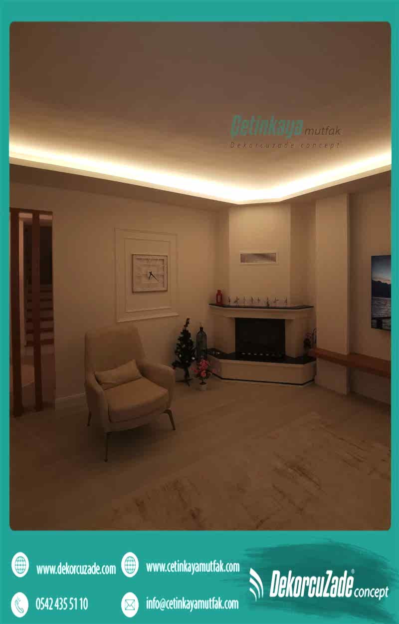 Evinizi anahtar teslim şeklinde değiştirirken Evlerinizin havasını değiştirecek tavan uygulamalarına değinmeden geçmek olmaz. Alçıpan gizli ışık kutu bant yada şerit led döşeme yapılarak dekoratif alanlar oluşturabilirsiniz Normal bir tavan kullanmaktansa alçıpan tavan modellerini kullanabilir,avize seçimi yapılmayacaksa yerine modern görüntüsüyle led ışıklı bir asma tavan kullanabilirsiniz. Evinizin havasını tamamen değiştirecek olan tavan uygulamalarını gönül rahatlığı ile tercih edebilirsiniz.Ankara Anahtar Teslim Villa Ev Ofis Tadilatı ve Dekorasyon